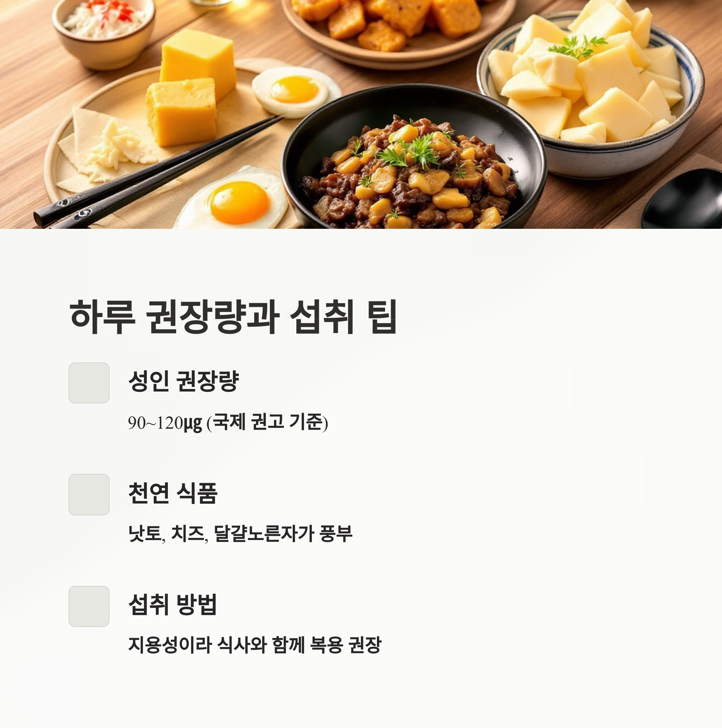 하지만 현대인의 식습관으로는 충분한 양을 섭취하기 어려운 경우가 많아요. 저도 처음엔 낫토를 먹어보려 했지만, 그 독특한 향 때문에 결국 치즈와 영양제를 선택했답니다. 😅