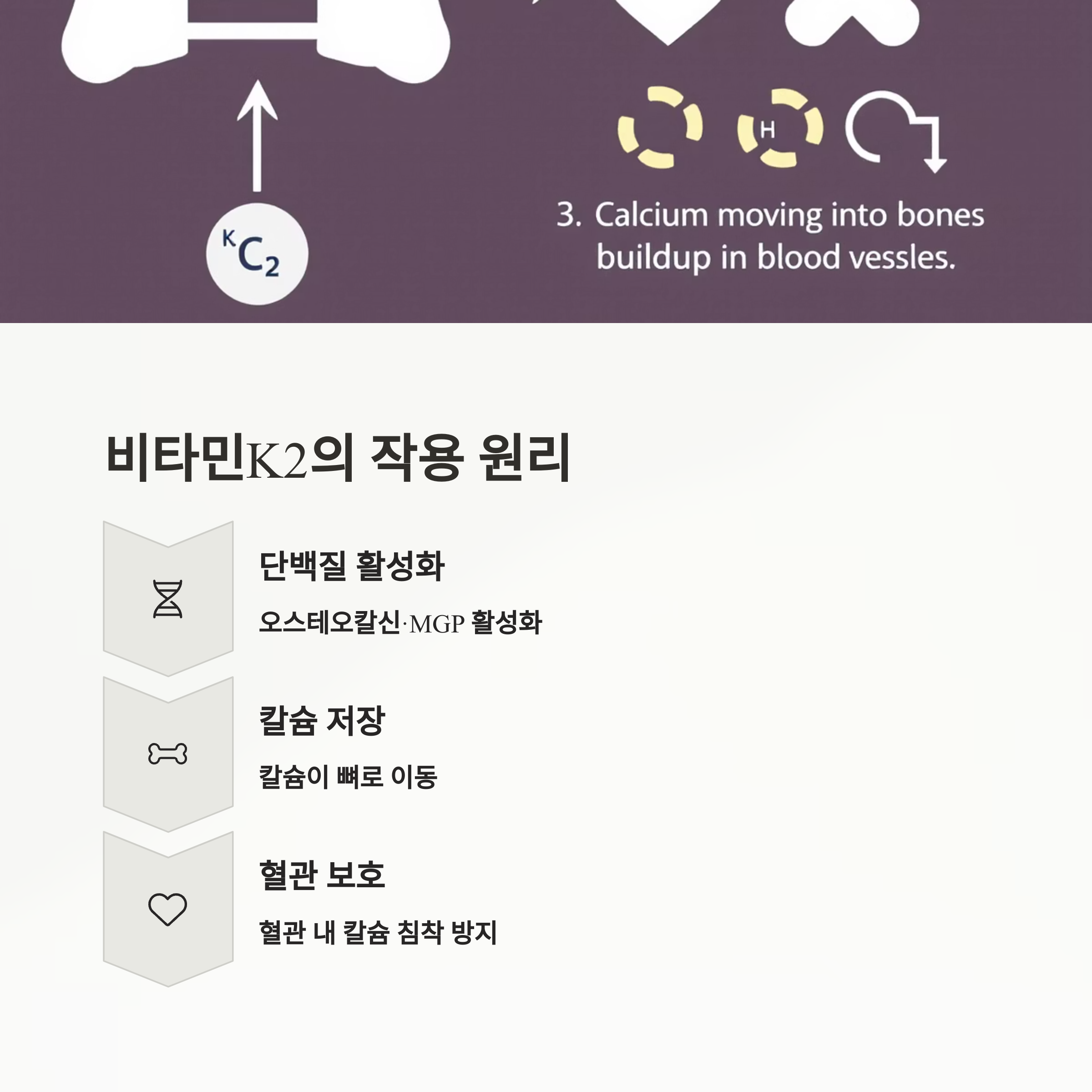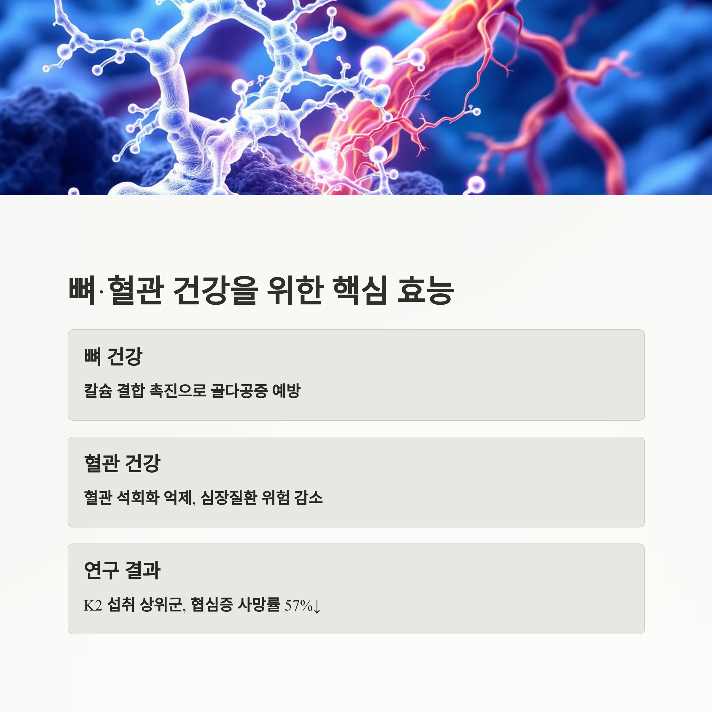 비타민K2는 혈관 벽에 칼슘이 쌓이는 ‘동맥 석회화’를 막아줘요. 칼슘이 혈관에 쌓이면 동맥경화나 심혈관 질환 위험이 커지는데, 비타민K2는 칼슘을 뼈로 보내고 혈관을 깨끗하게 유지하는 역할을 하죠.