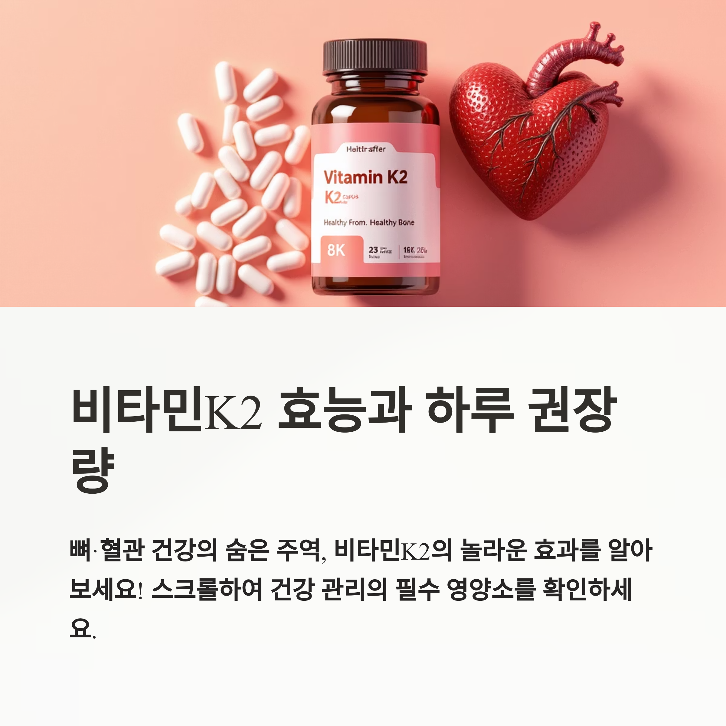 비타민K2 효능이 궁금하신가요? 뼈 건강과 혈관 건강을 책임지는 비타민K2의 놀라운 효과부터 하루 권장량, 섭취 팁까지 꼼꼼히 정리했습니다. 최신 정보를 바탕으로 여러분의 건강 여정에 도움이 될 정보를 알려드릴게요! 😊