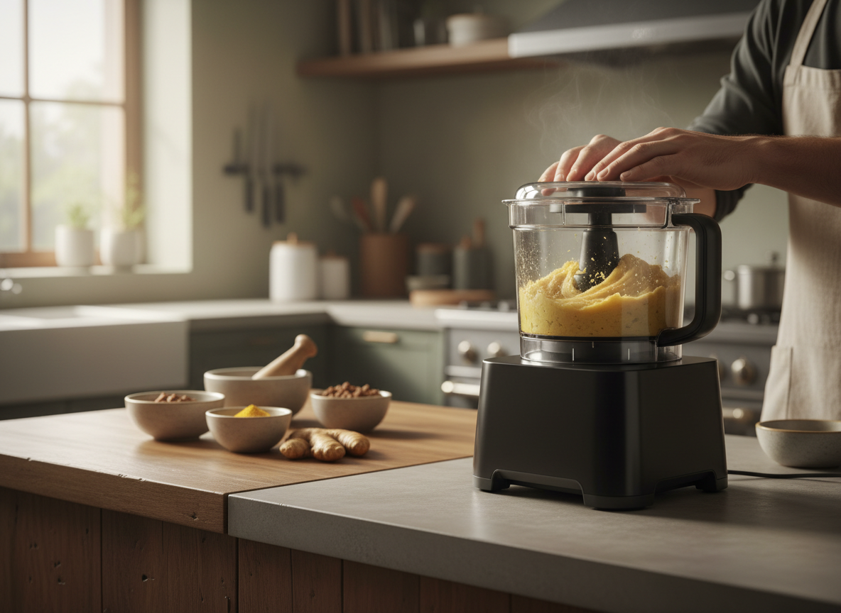 손질한 생강을 적당한 크기로 썰어 믹서기나 푸드 프로세서에 넣고 갈아줍니다. 씹히는 식감이 좋다면 굵게 다지고, 부드러운 청을 원한다면 곱게 갈아주세요. 착즙기를 사용해 즙만 내려도 깔끔하지만, 건더기에도 영양분이 많으니 함께 사용하는 것을 추천합니다.